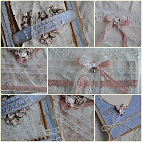 På denne har jeg brukt ark fra Pion design, diverse blonder kjøpt forskjellige steder i sommer, hyssing, bånd, gammel bokside malt med gesso, diverse knapper og tittelen har jeg valt å sette på vimpler med snor i.